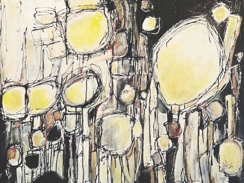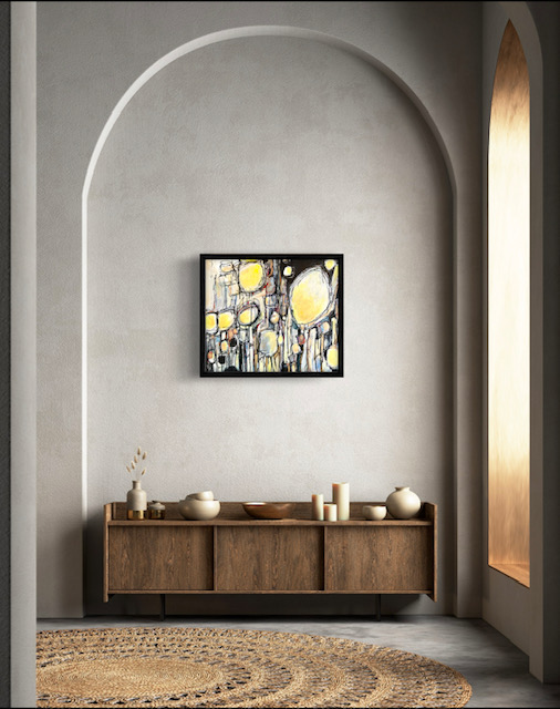 City Dawn illustre le réveil d’une métropole à travers des nuances de jaune lumineux, de gris brumeux et de noir profond. Une composition contrastée qui capture la transition entre la nuit et le jour.