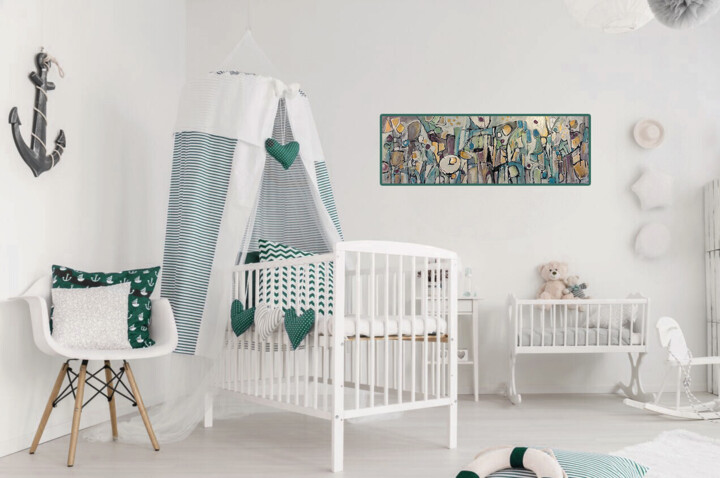 Une toile joyeuse et dynamique, parfaite pour apporter une touche ludique et lumineuse à une chambre d’enfants.