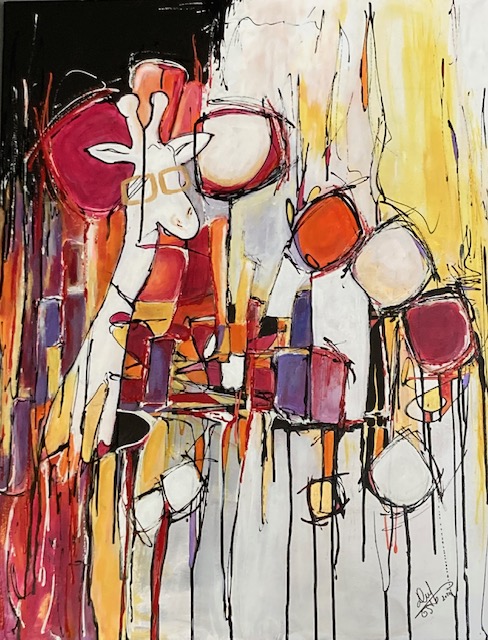 Girafe Coffee Shop est une œuvre abstraite baignée de teintes chaudes qui évoquent un univers pop et accueillant. Cette girafe stylisée flotte dans un espace texturé et dynamique, où les couleurs et les formes abstraites s’entrelacent pour recréer une ambiance de café à la fois chaleureuse et sophistiquée.