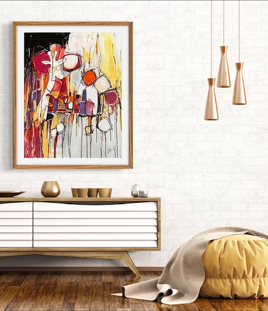 Girafe Coffee Shop is an abstract work bathed in warm tones, evoking a pop and inviting universe. This stylized giraffe floats within a textured and dynamic space, where colors and abstract shapes intertwine to recreate a café ambiance that is both cozy and sophisticated.