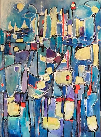 Souffle d’azur capture l’effervescence d’une ville à travers des éclats de couleurs vibrantes et des formes géométriques dynamiques, évoquant un paysage marin en fête. Une composition lumineuse qui invite au rêve et à l’évasion.